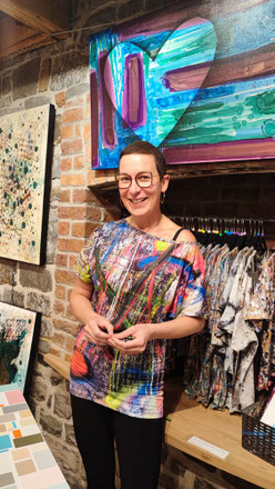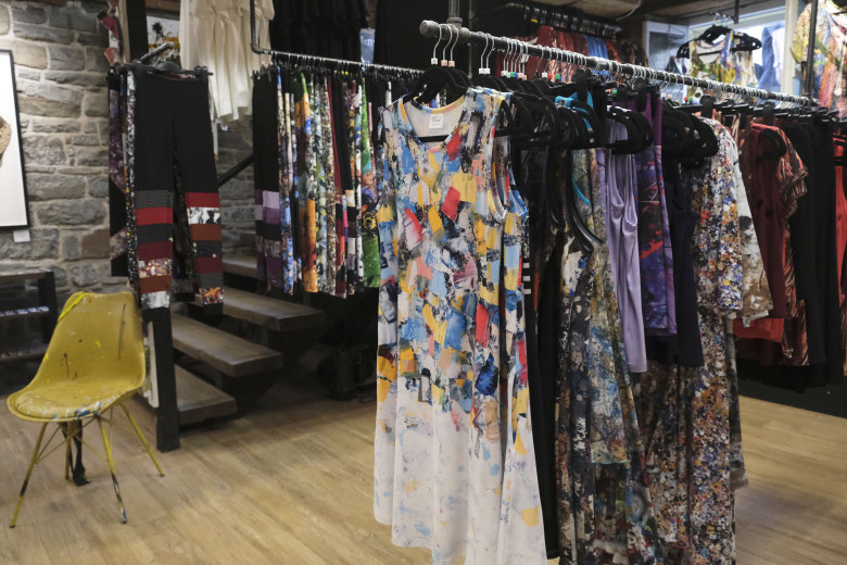Cette collection 100% locale et engagée transforme les œuvres d'Esther en pièces vestimentaires élégantes, permettant aux visiteurs d'emporter littéralement un morceau d'art québécois avec eux.