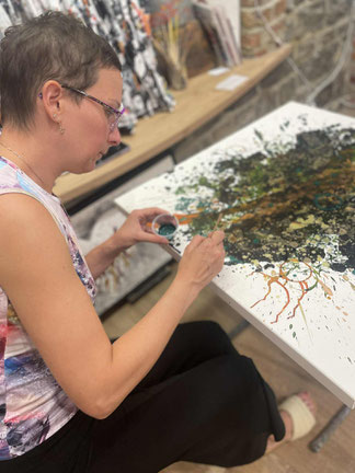 Elle travaille tantôt avec minutie, tantôt avec fougue, combinant pinceaux et spatules dans un élan spontané où la technique se met au service de l'émotion.
